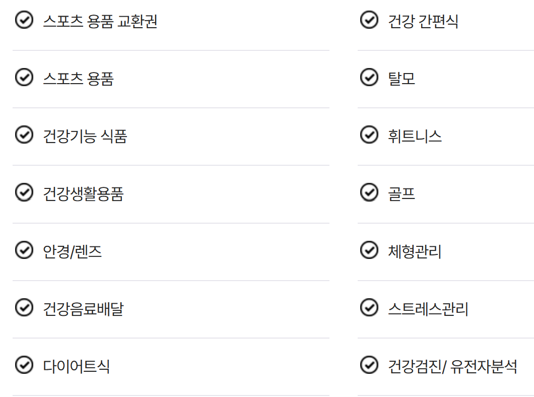 건강관리: 스포츠용품, 건강식품, 휘트니스, 안경/렌즈, 스트레스 관리 등