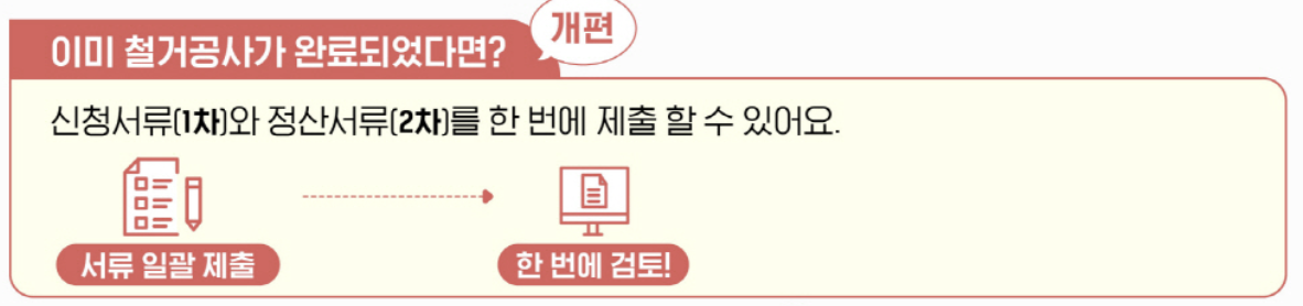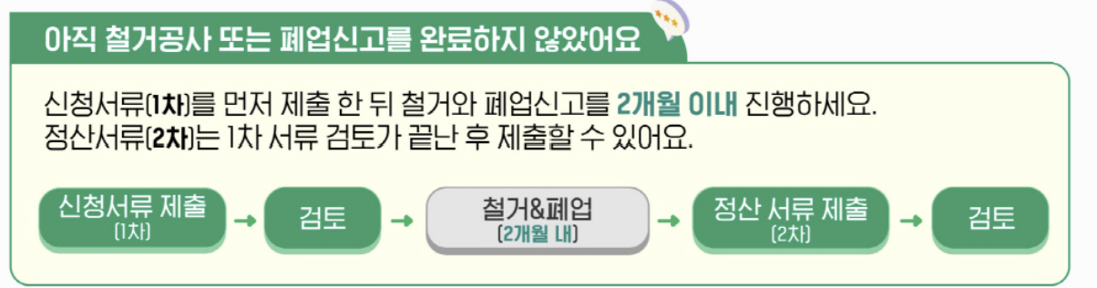 철거·폐업 → 신청서류(1차)+정산서류(2차) 일괄 제출 → 서류 일괄검토 → 비용지급 → 현장점검